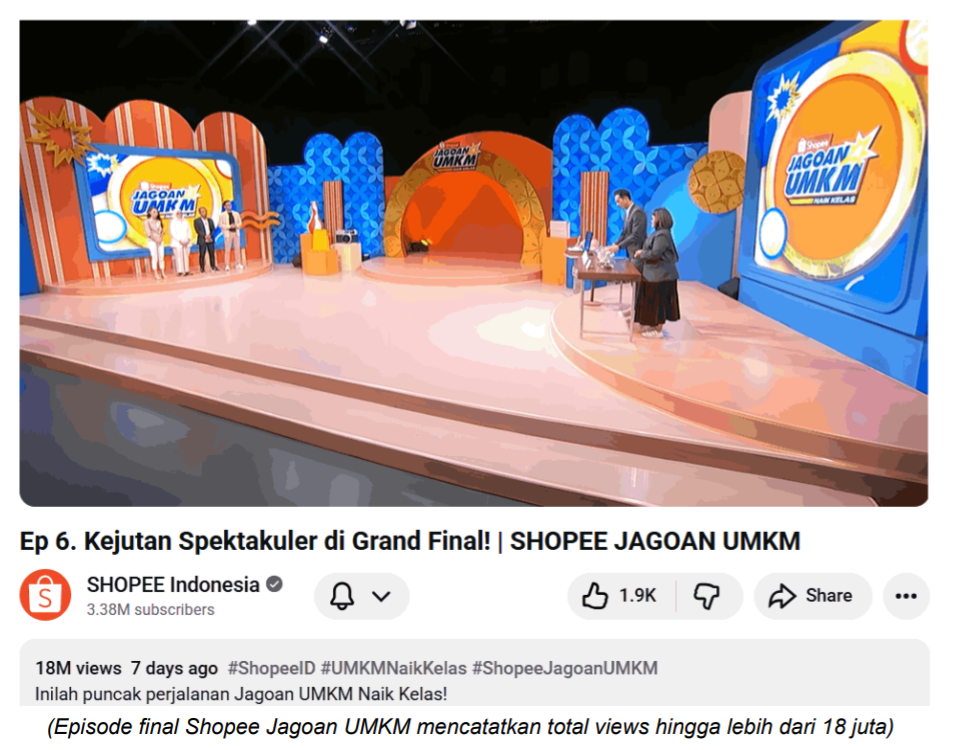 PONTIANAKINFO.COM, JAKARTA - Shopee Jagoan UMKM Naik Kelas, reality show UMKM perdana yang hadir dalam format web series di YouTube Shopee Indonesia, menutup enam episodenya dengan respon yang positif dari publik. Sejak penayangan perdananya, program ini langsung menarik perhatian publik berkat perpaduan kisah inspiratif, drama kompetisi bisnis, dan pesan pemberdayaan yang kuat. Hingga akhir penayangan, program ini berhasil mencatat lebih dari 85 juta views serta lebih dari 25 ribu likes dan komentar di YouTube Shopee Indonesia. Hasil ini menjadikan Shopee Jagoan UMKM Naik Kelas sebagai salah satu web series lokal yang menarik perhatian dan diterima di hati masyarakat.