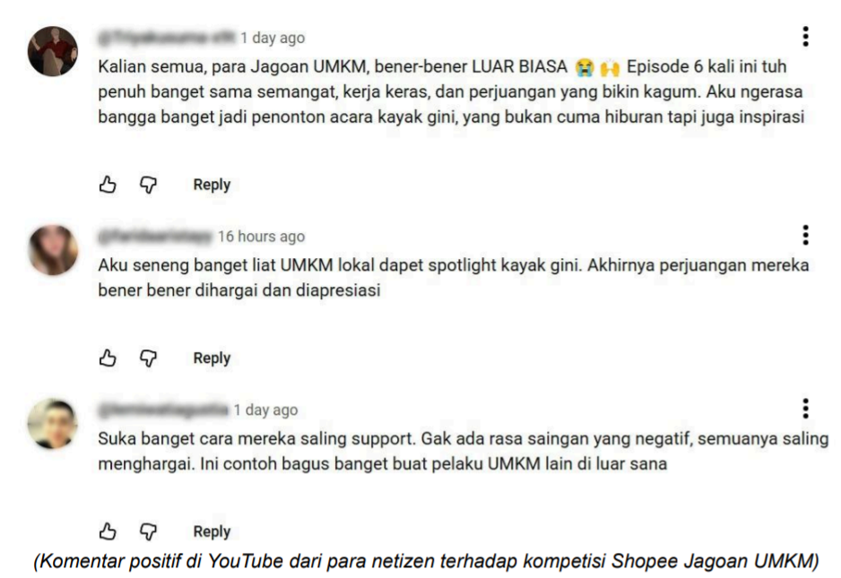 Banyak penonton mengaku terinspirasi oleh semangat dan keteguhan para pengusaha UMKM yang menghadirkan kisah perjuangan nyata penuh emosi dan motivasi, terlihat dari kolom komentar You Tube Shopee Indonesia yang dipenuhi ungkapan dukungan dan apresiasi dari netizen. Setiap tayangan tidak hanya memancing decak kagum, tetapi juga membangkitkan rasa bangga terhadap kreativitas dan daya juang anak bangsa yang berani berinovasi dan terus berusaha untuk naik kelas.