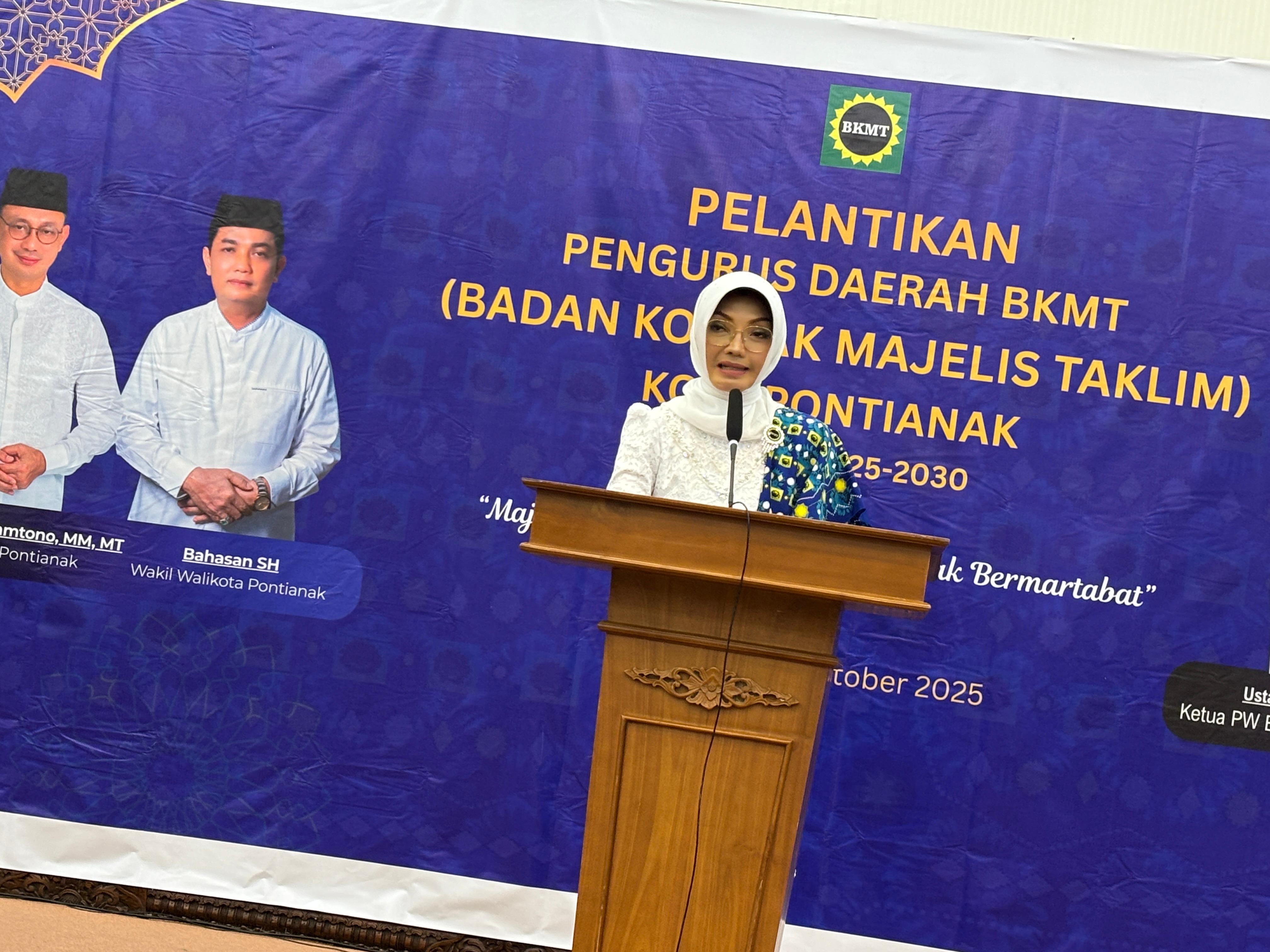 PONTIANAKINFO.COM, PONTIANAK - Pengurus Daerah (PD) Badan Kontak Majelis Taklim (BKMT) Kota PONTIANAK periode 2025–2030 resmi dilantik. Prosesi pelantikan dengan penyerahan bendera pataka dari Ketua PW BKMT Provinsi Kalimantan Barat (Kalbar), Ustadzah Sangadah kepada Ketua PD BKMT Kota PONTIANAK, Yanieta Arbiastutie, dilanjutkan dengan penandatanganan berita acara pelantikan di Aula Rumah Jabatan Wali Kota pada Sabtu, 25 Oktober 2025.